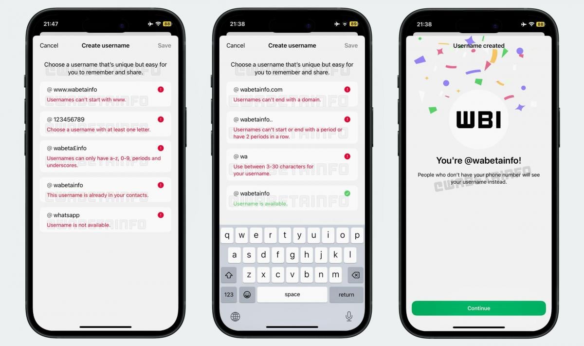 Согласно предварительной информации, юзернеймы должны включать как минимум одну букву, при этом необходимо указывать от 3 до 30 символов. После выбора допустимого никнейма WhatsApp подтвердит его с помощью анимации. С этого момента никнейм будет отображаться в разговорах и групповых чатах.