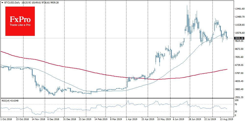 В очередной раз борьба за BTC разворачивается вокруг пороговых $10,000. За последние сутки эталонная криптовалюта теряет более 2%. Снижение цены происходит на фоне роста торговых объемов. Эффект от скорого запуска Bakkt сошел на нет, и сейчас в игру вернулось характерное для последнего времени «перетягивание каната».