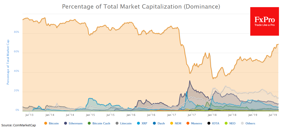 Индекс доминирования биткоина близок к 69%. Однако рынок криптовалют наводнен неликвидными криптопроектами. В списке CoinMarketCap – почти 2,500 криптовалют. Если отбросить весь неликвид и стейблкоины, то доля биткоина на рынке и вовсе может выйти за пределы 90%.