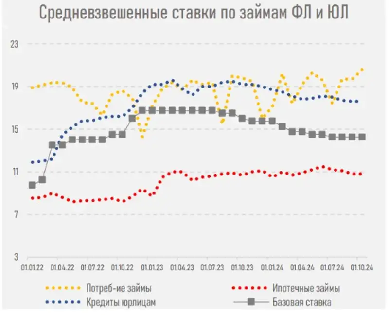 Аналитики резюмировали, что в 2024 году банковское кредитование сохраняется высоким и устойчивым, несмотря на общее замедление экономического роста (до 4% с показателя 4,9% за аналогичный период 2023 года) и все еще высокие процентные ставки в системе (базовая была снижена с 15,75% до 14,25%).