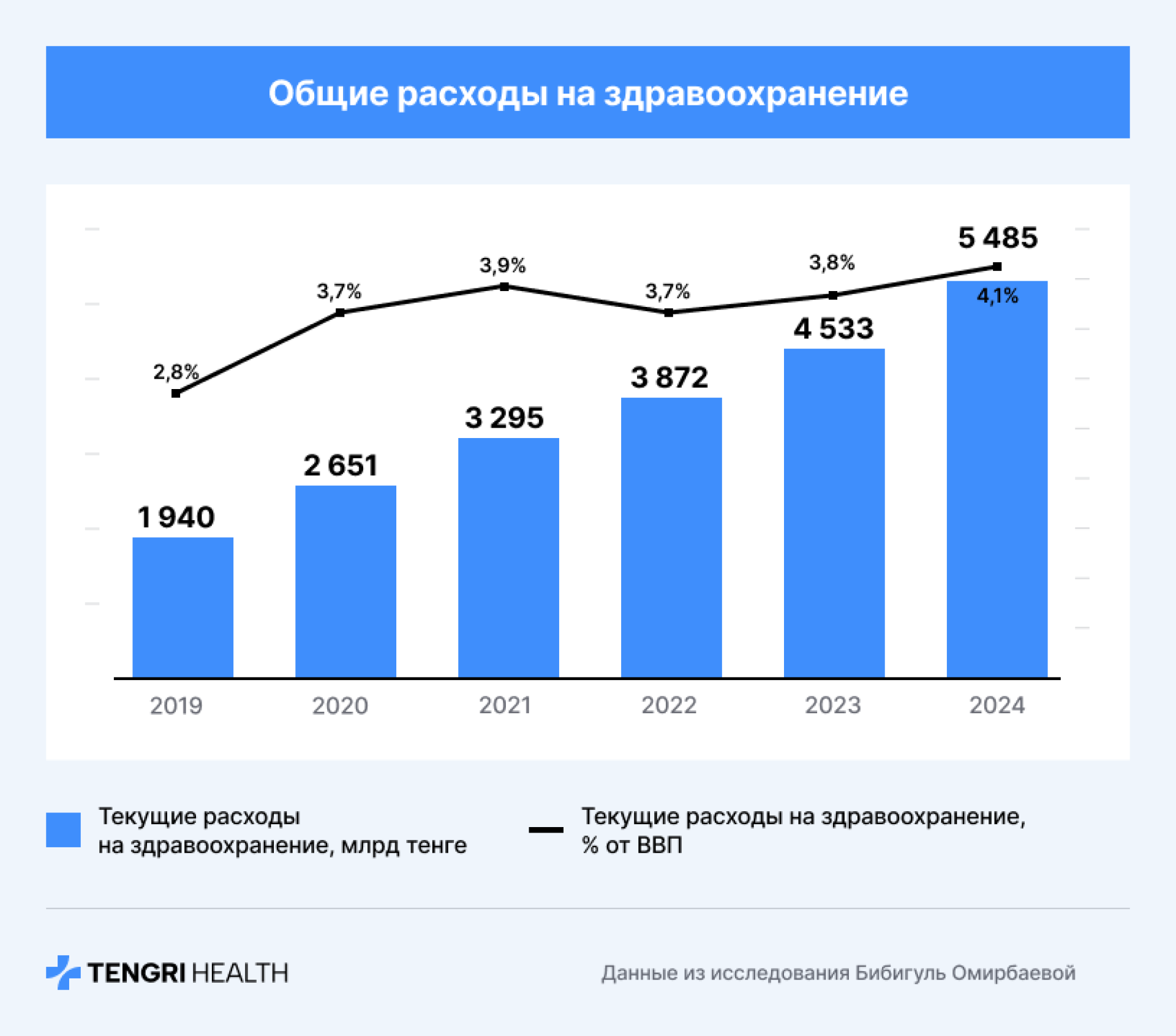 С момента внедрения обязательной системы медицинского страхования (ОСМС) государственные расходы на здравоохранение всё время растут: 1,2 триллиона тенге в 2019 году против 3,2 триллиона в 2024-м.