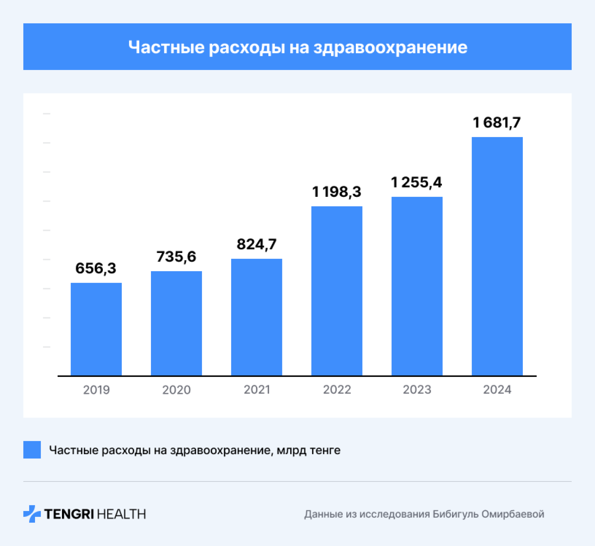 Казахстанцы с каждым годом вынуждены отдавать всё больше денег за прёемы врачей, УЗИ, анализы, операции. Показательно, что резкий рост карманных расходов (более чем на 400 миллиардов тенге) произошёл в 2024 году, когда и в систему ОСМС поступило на 250 миллиардов тенге больше.
