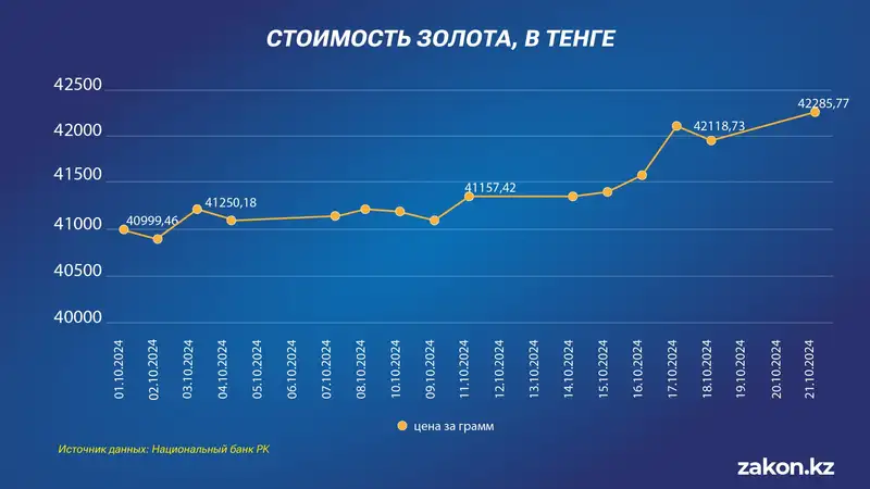 Цена на золото за последние несколько месяцев уже несколько раз обновила рекорд. Согласно данным Нацбанка РК 22 октября 2024 года, цена за грамм золота достигла 42 344,39 тенге. Таким образом с начала года грамм золота стал дороже примерно на 13 тыс. тенге.