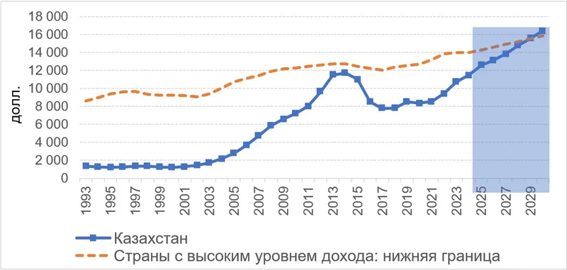 На сегодняшний день подушевой валовой национальный доход (ВНД) страны составляет 11,5 тыс. долларов, а к 2028-2029 гг. этот показатель позволит Казахстану официально войти в категорию экономик с высоким уровнем дохода (HIC) по классификации Всемирного банка.