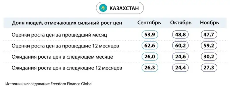 "В то время как оценки инфляции казахстанцев, наоборот, снизились, 47,7% жителей (48,8% – в октябре) заметили сильный рост цен в течение ноября. Однако в горизонте одного года доля заметивших значительное повышение цен падает шестой месяц подряд: с 60,2 до 59,2%. Напомним, что годовая инфляция в ноябре продолжила свое замедление, которое началось в марте и теперь составляет 10,3%", – отметил Данияр Оразбаев.